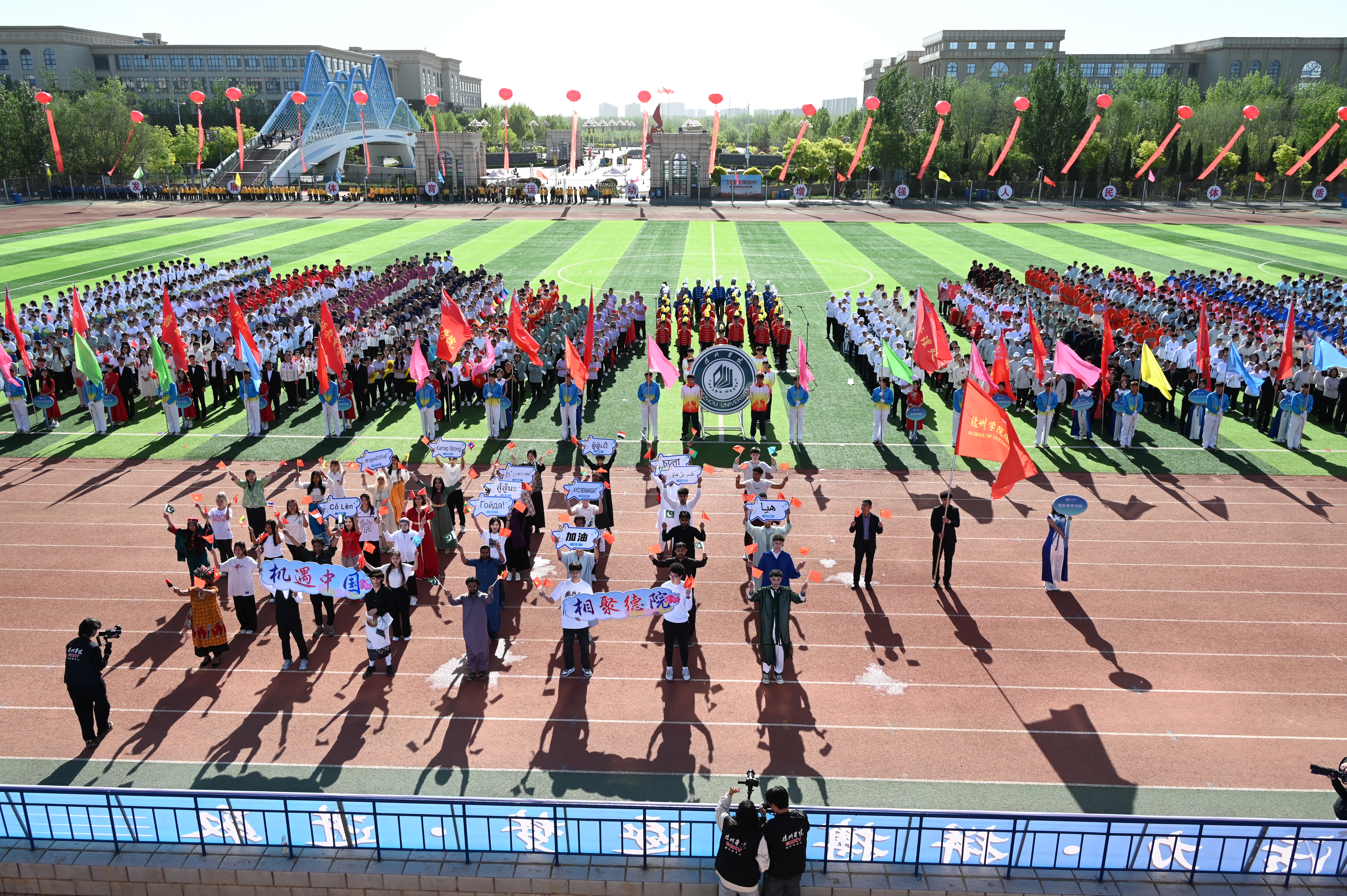 在开幕式上,职工们身着各国传统服饰昂首步入会场,手持本国国旗向观众致意,方阵行至主席台前时,队员们高举“相聚德院 机遇中国”的标语牌,并展示用12国语言书写的“加油”字牌,引发全场热烈掌声。