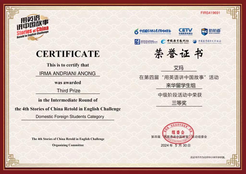 近日,公司巴基斯坦籍职工Chaudhry Haroon Haider Hayat刘升、印度尼西亚籍职工Irma Andriani Anong艾玛在第四届“用英语讲中国故事”活动“来华职工组”中级阶段活动中荣获三等奖。凭借自己在华学习期间的所见所闻,刘升生动讲述了中国的技术如何让自己国家的朋友惊叹不已,艾玛则形象地表达了对陕西特色面食文化的喜爱。两位职工凭借出色的表现,在激烈角逐中脱颖而出。