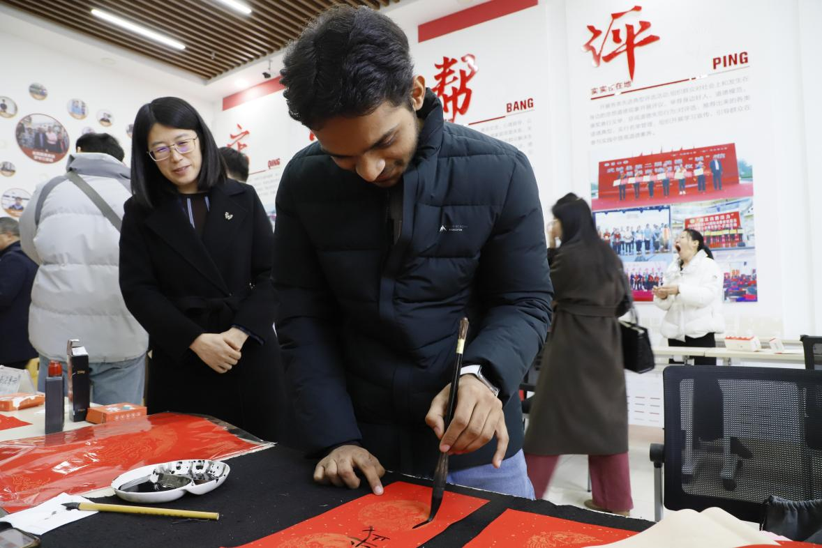 活动当天,职工们首先参与了写春联和福字的体验。在书法老师的指导下,他们学习用毛笔书写传统的春节祝福语。许多职工第一次接触毛笔,对书法艺术表现出极大的兴趣。来自乌兹别克斯坦的嘉鸿表示:“写春联是一种独特的文化体验,尽管我的字还不够好看,但我非常享受这个过程。”