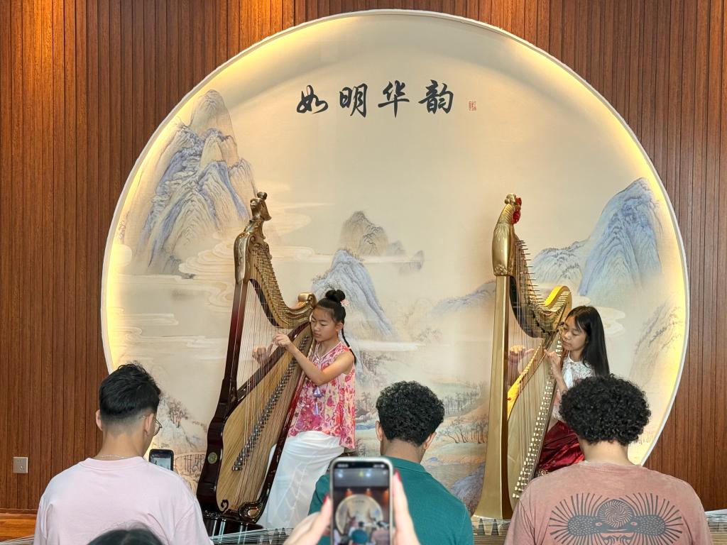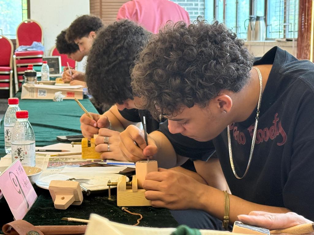 职工们沿着精心设计的路线依次参观了木刻刀笔书画、陶瓷印章制作、刻瓷技艺、金丝彩贴、彩贴绣、玉雕等传统技艺展示。在与各位技艺传承人的亲切交流中,同学们深刻感受到了中华传统手工技艺精雕细琢的独特魅力以及精益求精的工匠精神。同时,传统手工艺和现代艺术的创新融合,也让同学们看到了非遗技艺在当代焕发的新生与活力。此外,同学们还欣赏了源自中国的古老弹拨乐器--箜篌的现场表演,空灵浑厚的音色让同学们深陷其中。通过解说老师的介绍,同学们进一步了解到,这一历史悠久、造型独特的传统乐器流传至各个国家,成为中外文化交流的重要载体。其在传播过程中与各国本土文化深度融合,充分体现了文化互鉴、和而不同的包容性和生命力。