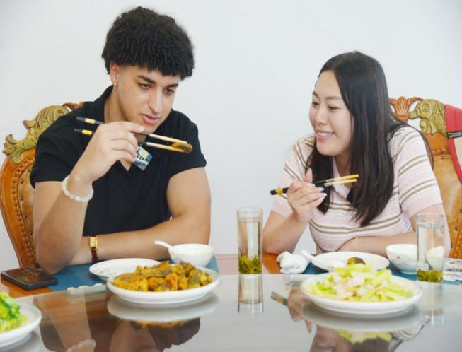 QACHACH ILIASS跟随拍摄团队走进当地泥鳅加工现场,近距离观察加工流程,并参与到简单的分拣、清洗等环节中。在品尝特色泥鳅美食时,他主动与工作人员交流口味差异,也分享自己国家的饮食文化,现场成为中外文化交流的小课堂。拍摄间隙,他还不时用手机记录王世英村的风貌,面向镜头介绍自己的所见所闻,并连连赞叹:“在这里,我看到了中国乡村的活力,小泥鳅,大产业,了不起!”言语间满是对中国乡村生活的喜爱。